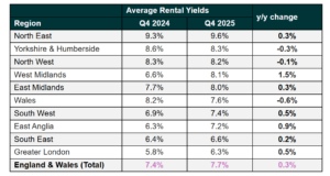 - The North East remained the top-yielding region across Q4 with rental yields of 9.6%